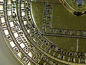 ![]() Detail of markings on the 4 inch Astrolabe Time is shown A B C for 1, 2, and 3 o'clock etc. Star points are labeled Time of year is given in the degrees of the Zodiac Calander |